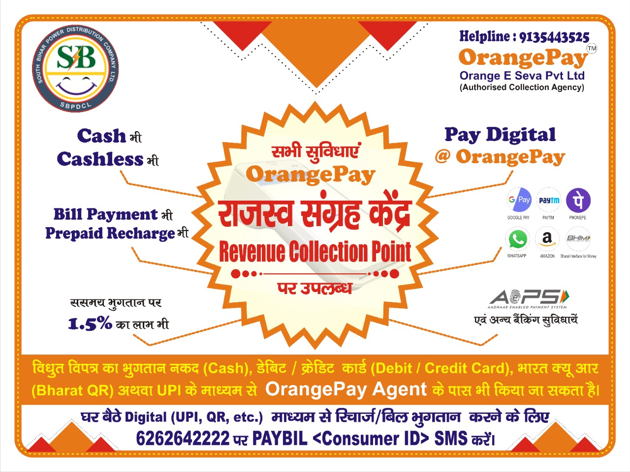 OrangePay is authorized revenue collection agency of South Bihar Power Distribution Company Limited (SBPDCL).